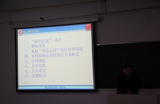 12月21日下午,我校成人教育学院师训科科长王启明教授在文化路校区6号楼506教室为我院2015国培计划乡村教师访名校培训项目学员做国培政策解读的专题讲座。