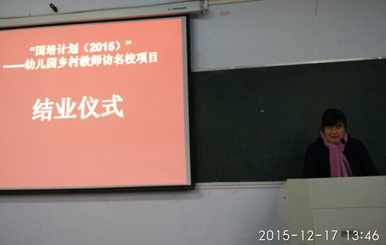 12月17中午,我院承办的国培计划“河南省乡村教师访名校乡村公民办幼儿园教师培训项目”结业典礼在文化路校区6号楼506教室举行,李站营老师主持典礼,我院国培团队所有师生出席了典礼。