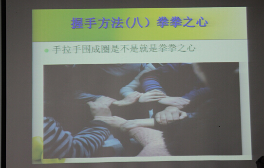 此次活动课以幼儿心理游戏为主题,以团体组织的方式进行,主要操练了同心同德、心心相印和一心一意等九种握手方式。
