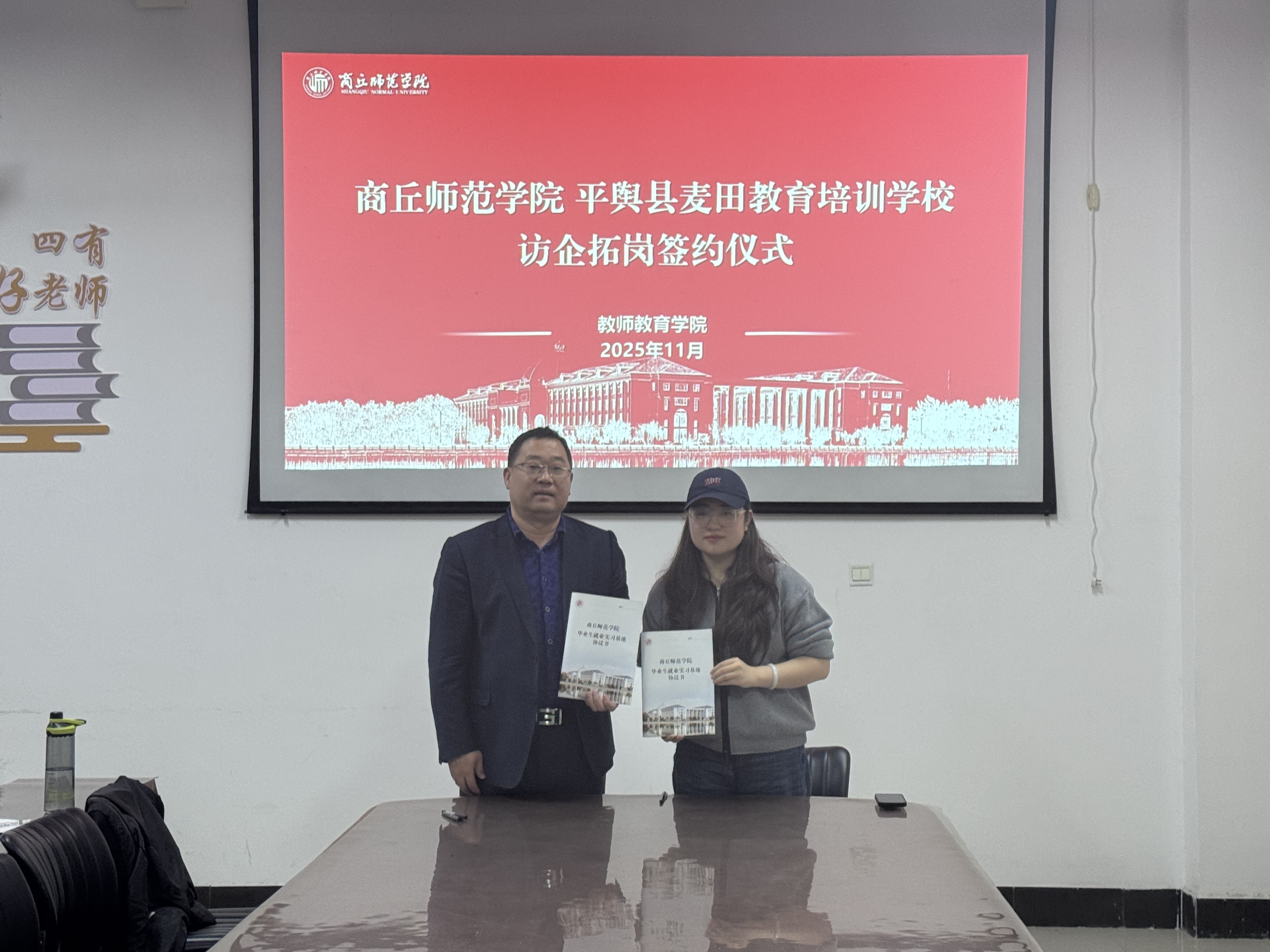学院邀请平舆县麦田教育培训学校商谈毕业生实习就业校企合作项目,党委书记郭宁、院长孙旭、党委副书记邱友谊、毕业班辅导员朱冠宇、部分2026届毕业生参加会议。