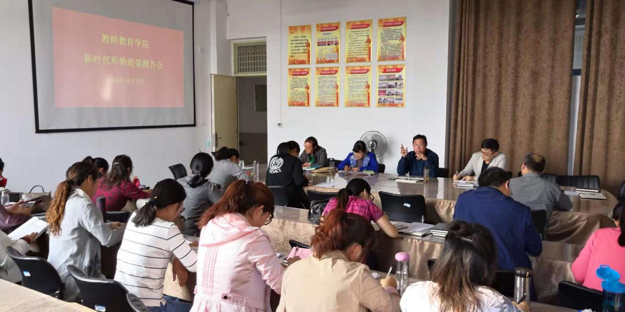 2018年10月12日下午,教师教育学院党总支书记刘骥鹏在实验组团203党员活动室举办了一场题为“提升政治站位,深刻理解贸易战背景下的中国应对策略”的形势政策报告会,参加会议的有学院领导和全体教师,会议由党总支副书记、院长韩桂玲主持。