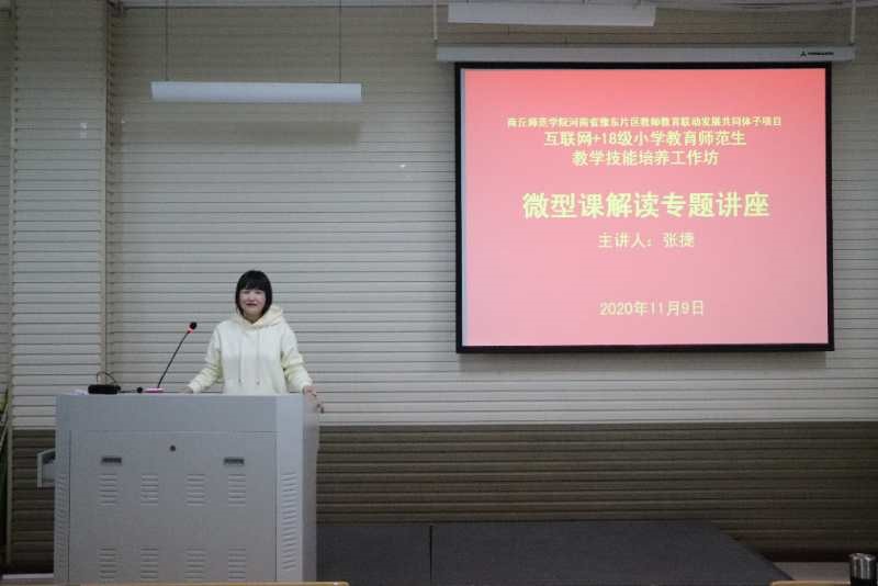 为提高我院18级小学教育(全科教师)专业学生的整体素质和教学水平,促进学生专业成长。11月9日下午商丘师范学院教师教育学院于汉梁楼310教室举办小学语文工作坊“微型课解读专题讲座”,特邀商丘市民主路第二小学张捷老师进行本次讲座。教师教育学院副院长井祥贵、初等教育系部分教师与全体小学语文工作坊成员参加了本次活动。
