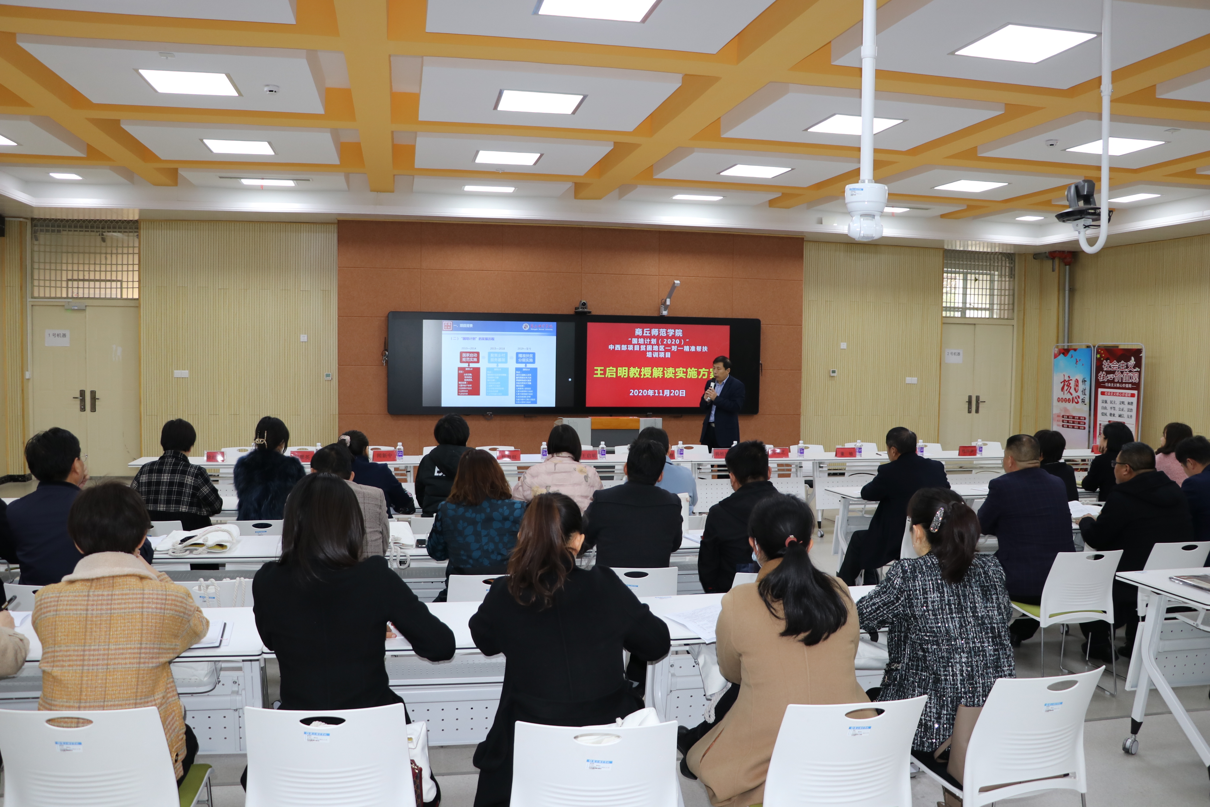 国培项目指导专家、我校继续教育学院王启明教授着眼于如何实质性提升贫困地区中小学的教科研及管理水平、农村学校如何准确制定客观可行的发展规划以及如何对乡村学校青年教师予以及时必要的帮助以促使他们快速成长为所在学校的骨干力量等问题,秉承建立在大量实地调研和指导案例基础上的科学视野,结合自己多年来从事国培、省培工作的经验,对本次的一对一帮扶项目实施方案进行了长达三个多小时的深入、精确解读。台下各个学校的一线教师们还同王教授积极互动,反响热烈,收益良多。