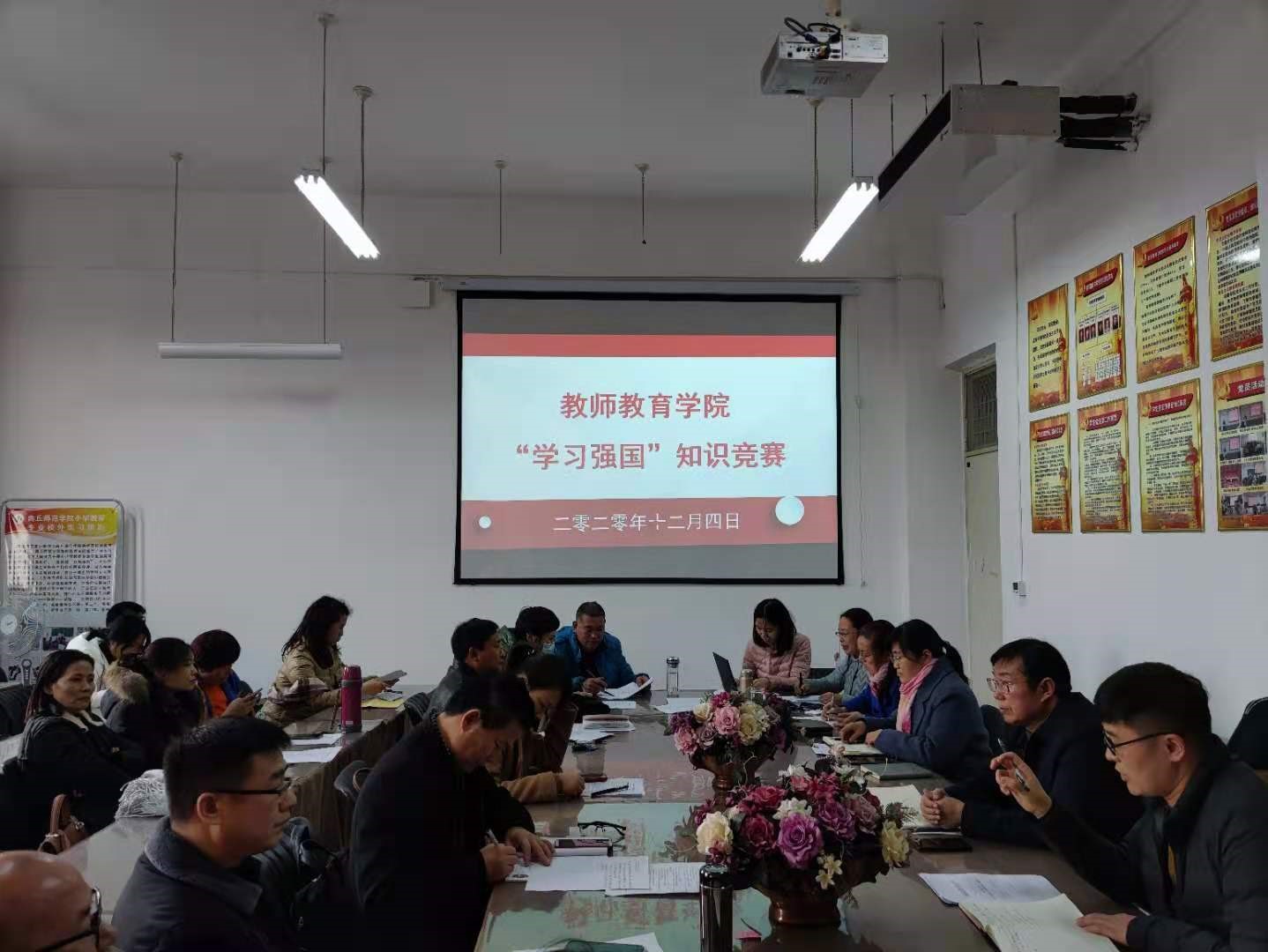 2020年12月4日,教师教育学院组织全体老师参加“学习强国”知识竞赛活动。活动开始,刘书记强调全体党员要以“学习强国”平台为依托,不断加强学习,丰富自身知识、提高个人素养。