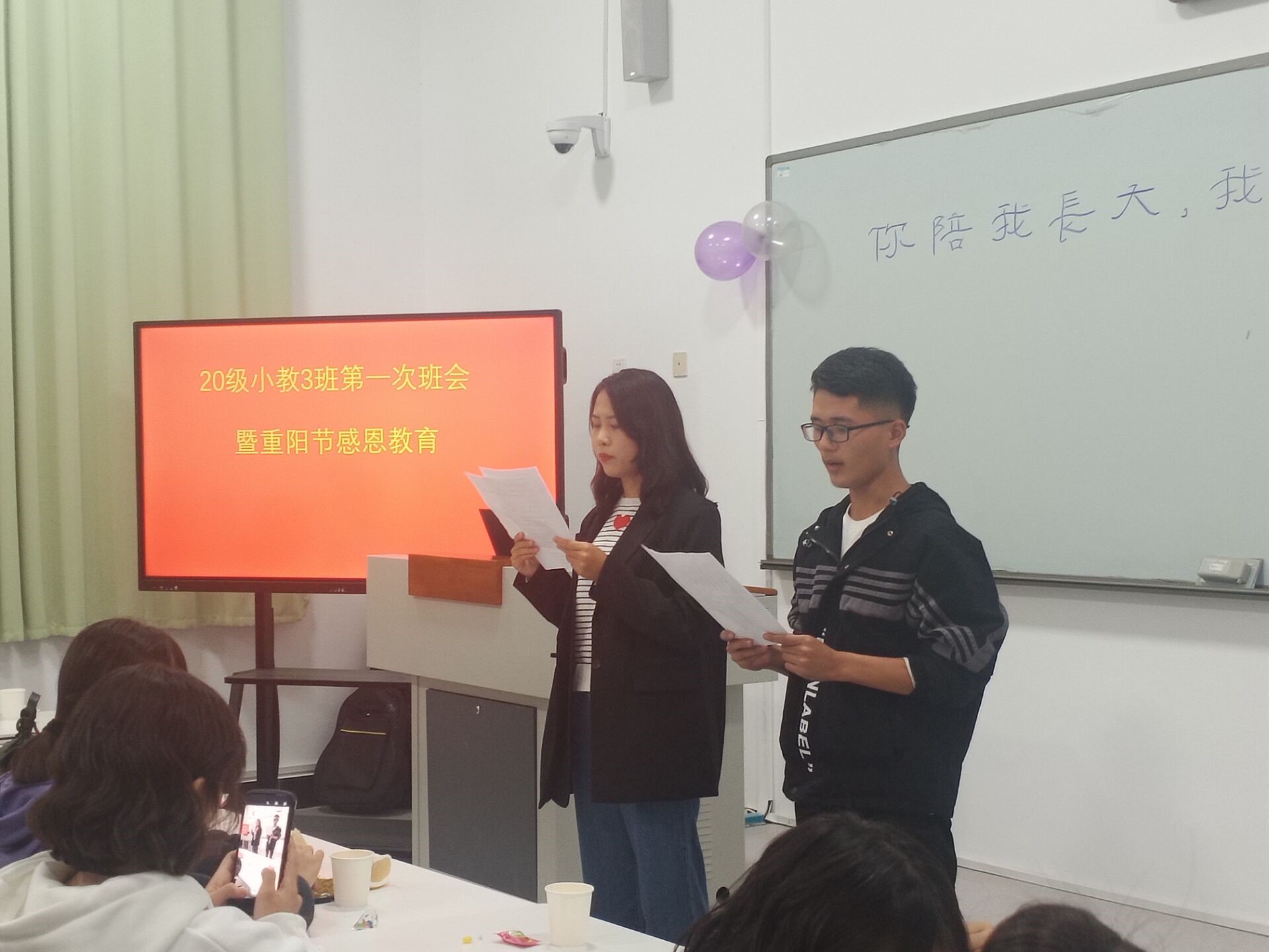 为了欢迎20级新生学生,20级3班于10月26日在行方楼230教室举办了“你陪我长大,我陪你到老”主题班会,参会人员有20级小教全科全体人员和班主任王丹丹老师。