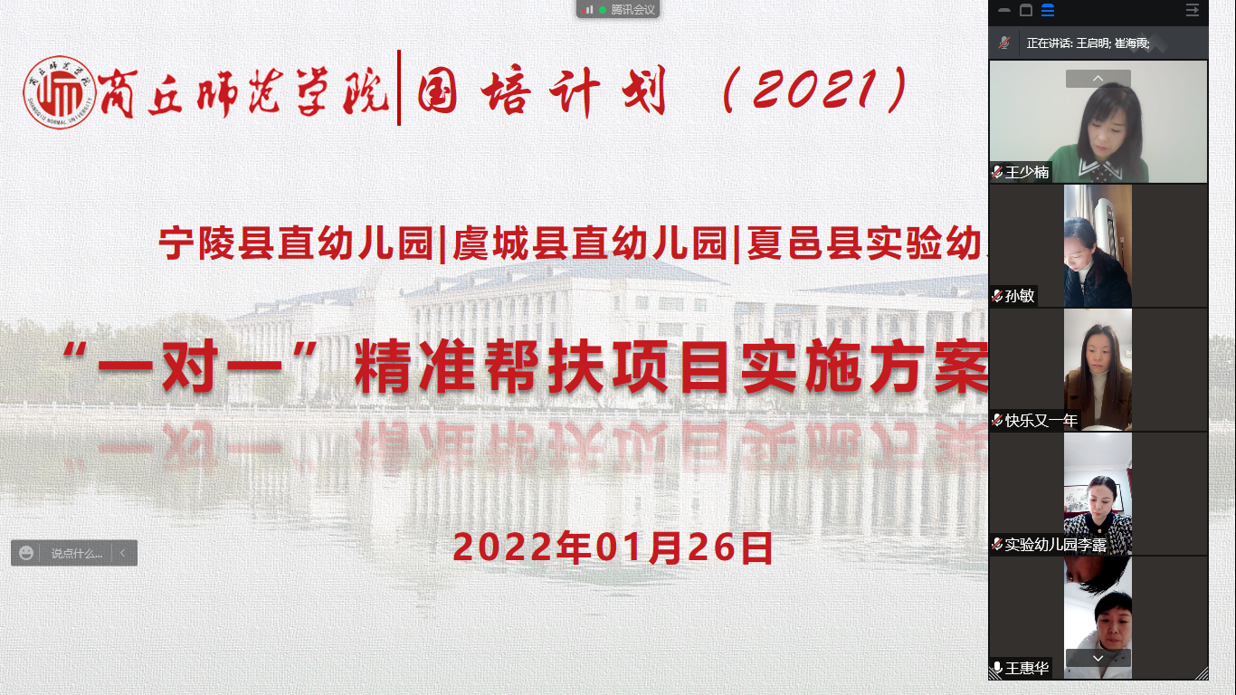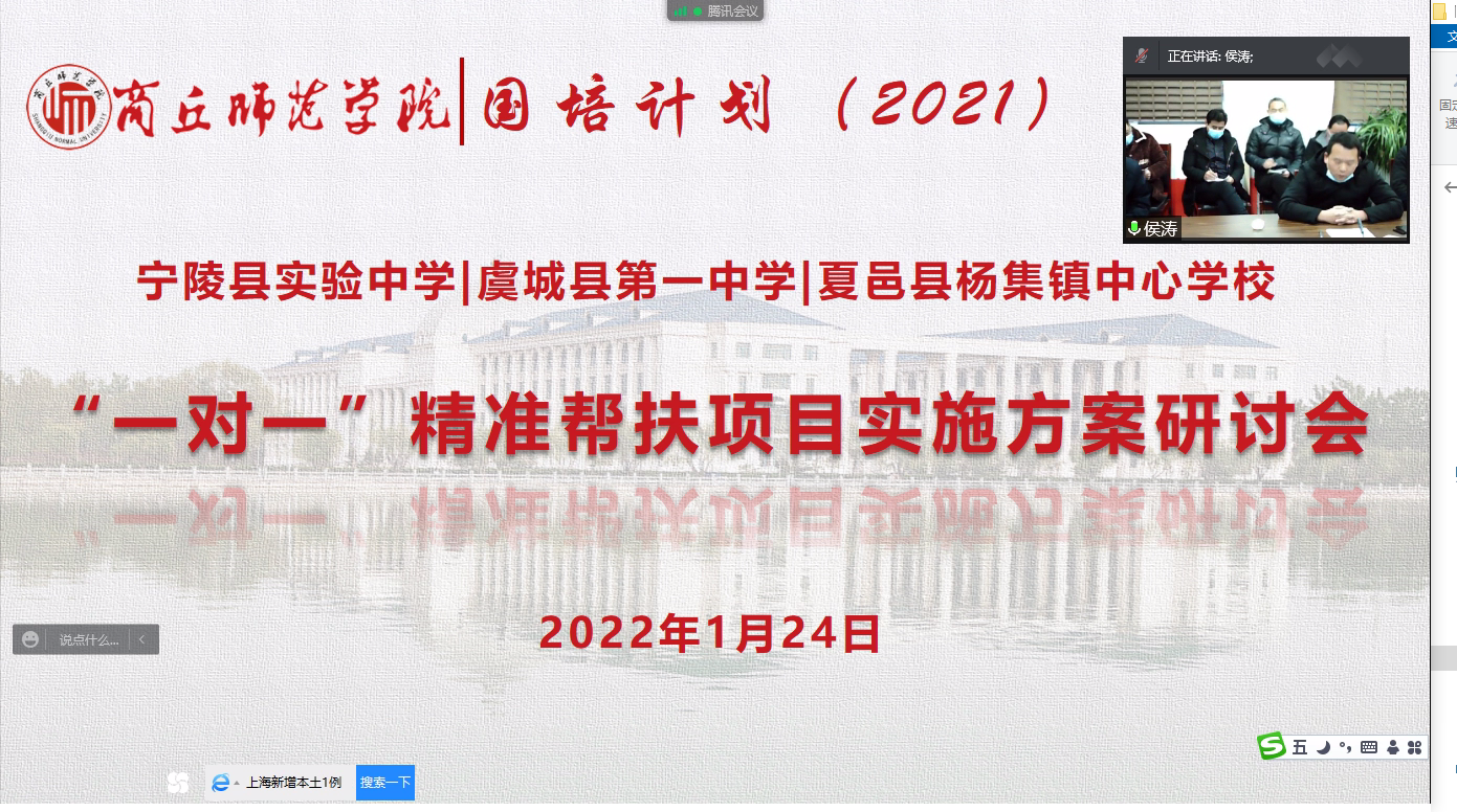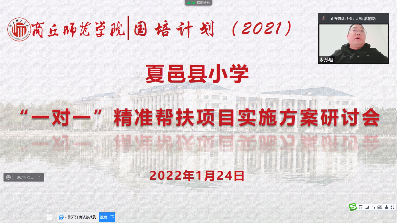 2022年1月23-26日,“一对一”精准帮扶培训项目实施方案研讨会通过腾讯会议顺利召开,河南省教师教育专家、我校继续教育学院教授王启明,宁陵、夏邑、虞城县教体局师训股负责同志,我校教师教育学院相关专家,优质学校帮扶专家,被帮扶学校核心团队成员近300人参加会议,会议由教师教育学院院长孙旭主持。