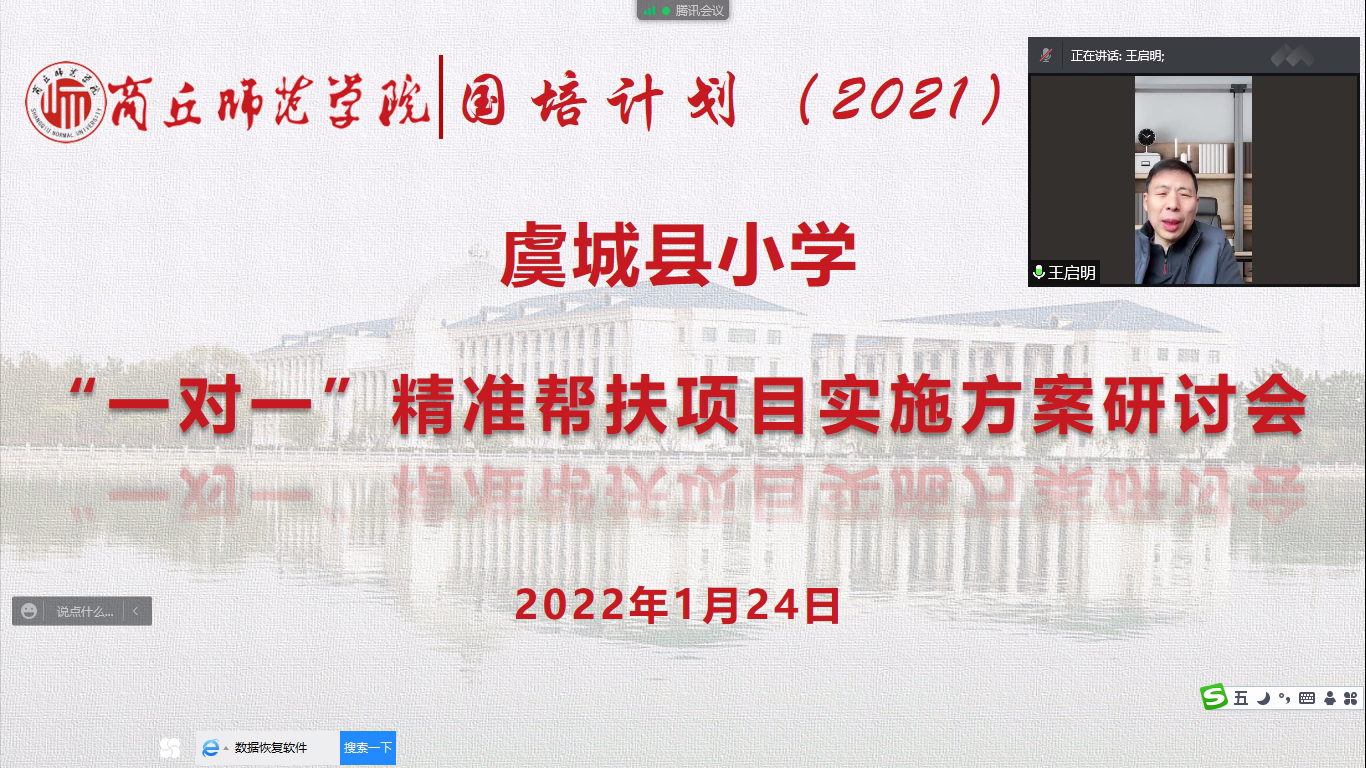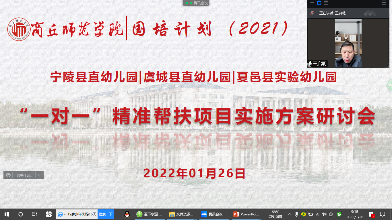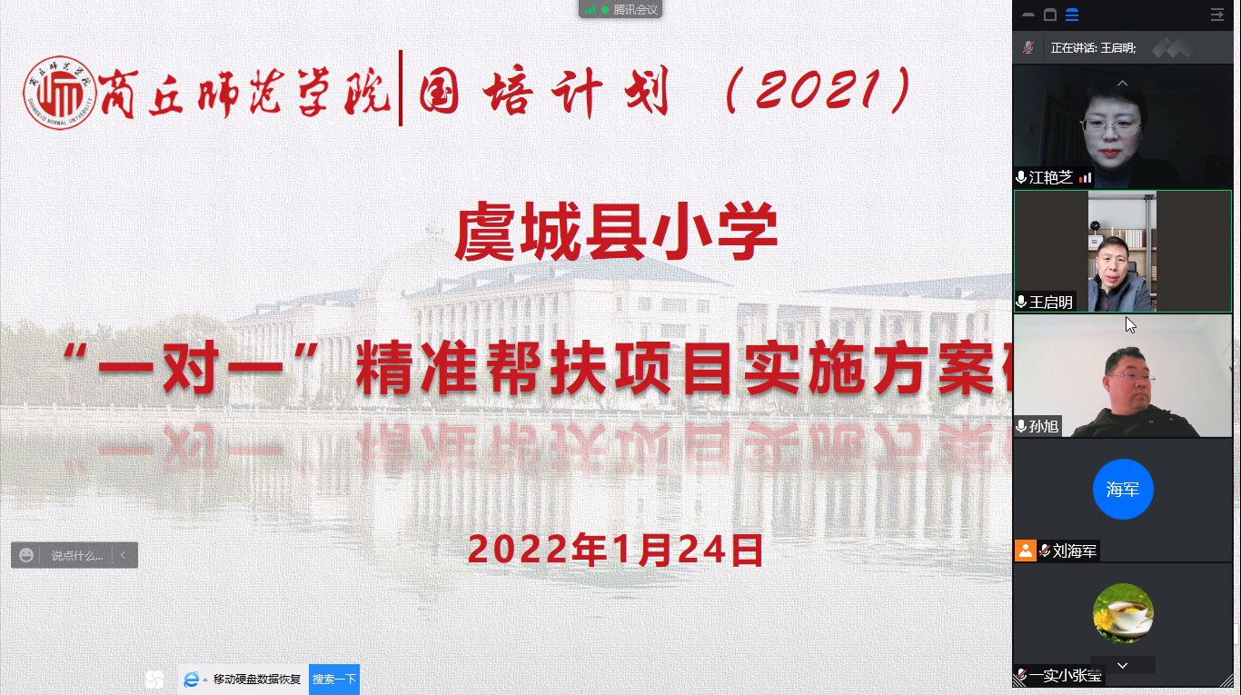 2022年1月23-26日,“一对一”精准帮扶培训项目实施方案研讨会通过腾讯会议顺利召开,河南省教师教育专家、我校继续教育学院教授王启明,宁陵、夏邑、虞城县教体局师训股负责同志,我校教师教育学院相关专家,优质学校帮扶专家,被帮扶学校核心团队成员近300人参加会议,会议由教师教育学院院长孙旭主持。