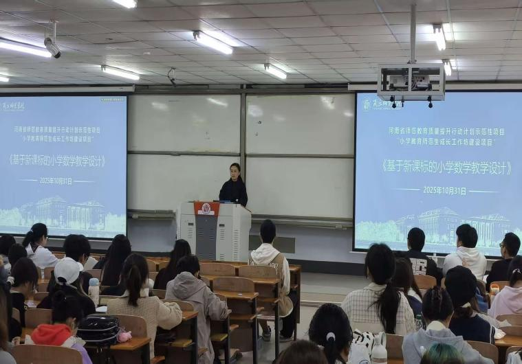10月31日,河南省师范教育质量提升行动计划师范生成长工作坊示范性项目:小学教育师范生成长工作坊在智圆楼110教室开展《基于新课标的小学数学教学设计》专题讲座。讲座旨在助力师范生精准把握新课标理念、提升小学数学教学设计的专业性与实效性,主讲人是商丘市前进小学的正高级教师、中原名师、河南省教师教育专家李巍,2023级小学教育专业全体学生收听讲座。