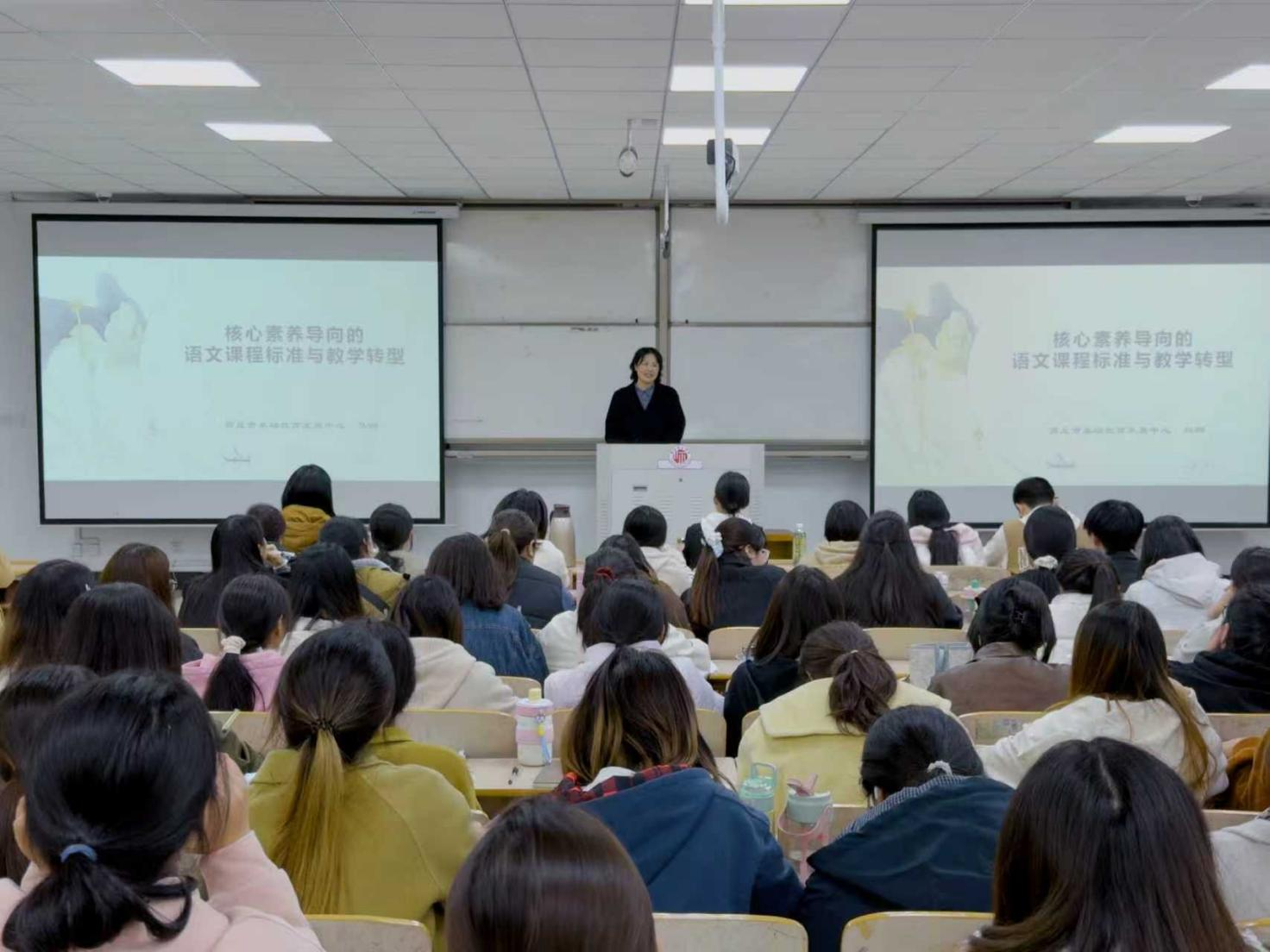 11月10日,河南省师范教育质量提升行动计划师范生成长工作坊示范性项目小学教育师范生成长工作坊,在商丘师范学院行方楼218教室开展《核心素养导向的语文课程标准与教学转型》专题讲座。本次讲座旨在引领小学教育专业学生把握语文课程理念,掌握核心素养导向的教学方法,主讲人是商丘市基础教育发展中心小学语文教研员、河南省特级教师马娜,2023级小学教育专业全体学生参加本次活动。