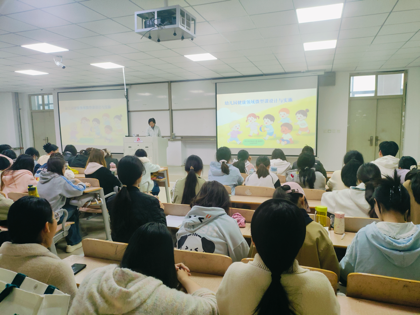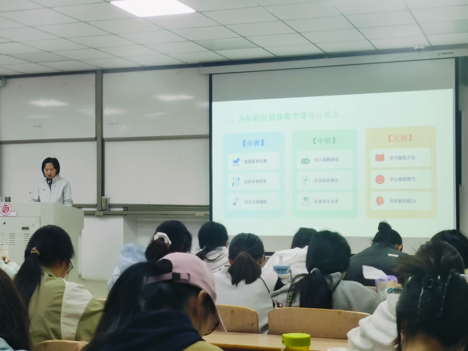 为进一步深化学前教育专业学生对微型课教学的理解,精准掌握幼儿园健康领域课程设计与实施要点,2026年4月21日,教师教育学院学前教育师范生成长工作坊邀请商丘市实验幼儿园潘青华老师开展了一场主题鲜明、内容务实的幼儿园健康领域微型课专题培训。培训现场氛围浓厚,同学们专注聆听、收获颇丰。