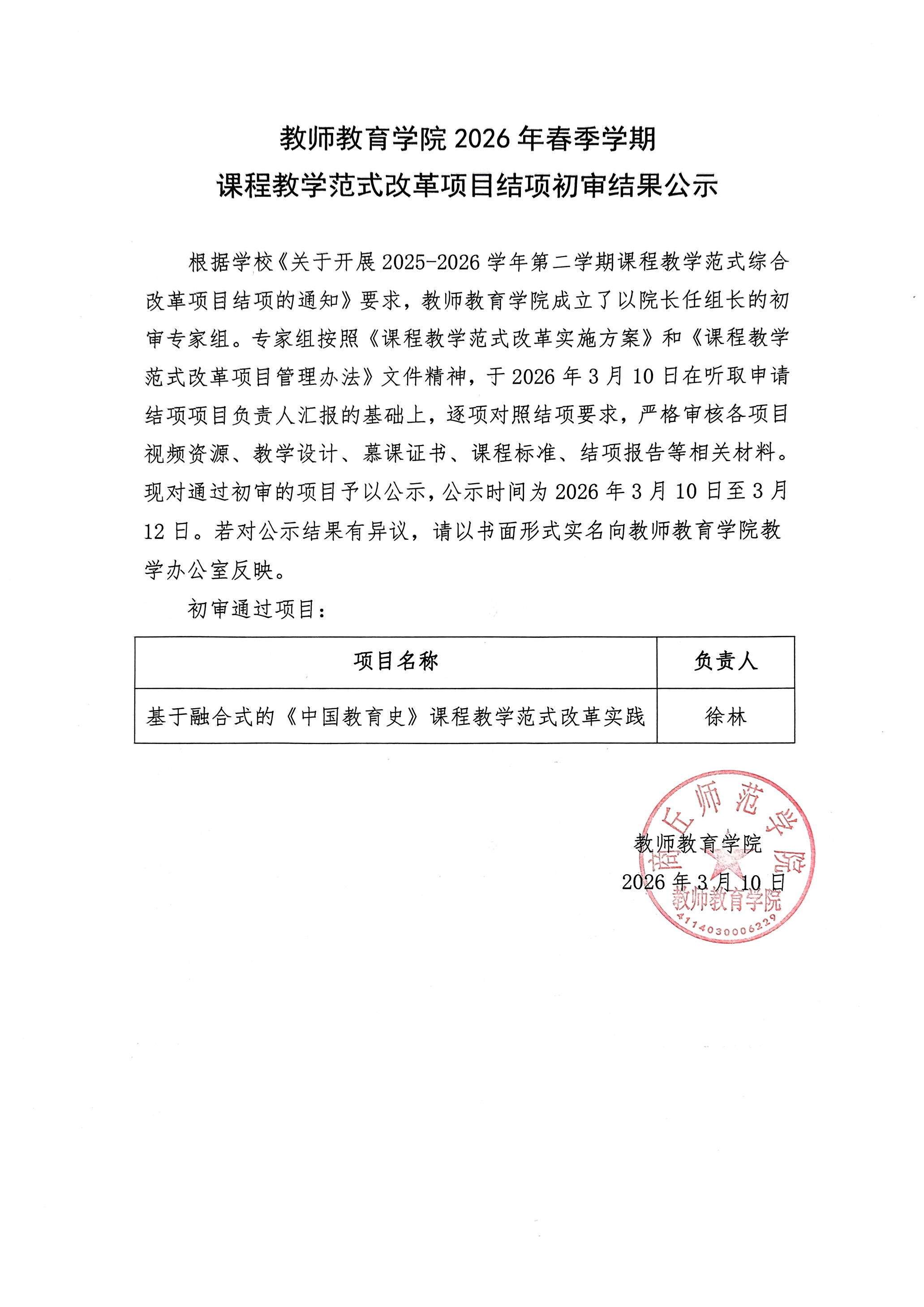 教师教育学院2026年春季学期课程教学范式改革项目结项初审结果公示